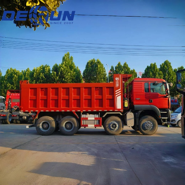 Sinotruk Howo Sitrak 8x4 dump tipper truck is outstanding in the field of engineering transport with its strong power and high loading capacity. The truck is equipped with MC series engine of China National Heavy Duty Truck, such as MC11.44-60, inline six-cylinder, water-cooled, four-stroke, supercharged intercooler, high-pressure common rail, with a displacement of 10.518L, a max horsepower of 440 hp, a max output power of 324kW, a max torque of 2,100N-m, a torque speed range of 1000-1400rpm, strong power, and it meets the National VI emission standard. The transmission system is matched with China National Heavy Duty Truck (HW25712XS) 12-speed gearbox, paired with a 452 rear axle with a speed ratio of 5.45, which ensures high power transmission efficiency and smooth gear shifting to adapt to a variety of complex working conditions. The wheelbase is 1950 + 4025 + 1350mm, the size of the cargo box is 8000 × 2350 × 1500mm, the rated load capacity is 15370kg, and the maximum total mass is 31000kg, which can satisfy the transport demand of large-scale engineering projects. The cab is equipped with a four-point airbag suspension system, which effectively reduces vibration and improves driving comfort. It also carries a number of intelligent driving assistance systems, such as 360° surround view, tachograph, tyre pressure monitoring, fatigue driving warning, etc., to improve driving safety.